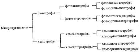 Таким образом, принимая во внимание тип питания (авто- или гетеротрофное), природу донора электронов источник энергии (свет или химическая реакция), возможные сочетания вариантов конструктивного и энергетического обменов можно представить в виде следующей схемы.