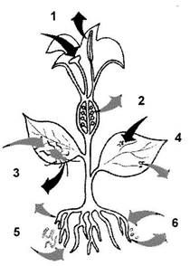 1 - передача за допомогою пилку; 2 - передача за допомогою насіння; 3 - за допомогою векторів-комах; 4 - при прямому контакті з рослинами (механічному пошкодженні); 5 - за допомогою еекпюрів-нематод; 6 - за допомогою векторів-грибів.