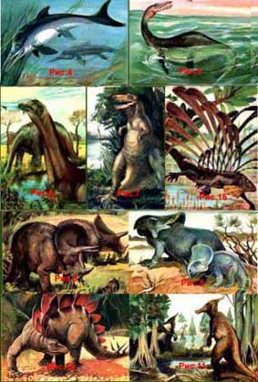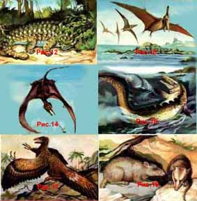 В органическом мире триаса, первом периоде мезозоя преобладают мезозойские формы, но вместе с тем еще существенную роль играли представители палеозойской фауны и флоры. Из морских позвоночных характерны костистые рыбы, а также двоякодышащие, рептилии – ихтиозавры (Рис.4) и плезиозавры (Рис.5). Позвоночные суши пополняются динозаврами – бронтозаврами (Рис.6), тарбозаврами (Рис.7), трицератопсами (Рис.8), протоцератопсами (Рис.9), стегозаврами (Рис.10), зауролофами (Рис.11), пинакозаврами (Рис.12) и пр. Рептилии осваивают воздушное пространство, в начале юрского периода появляются птеранодоны (Рис.13), сордесы (Рис.14), лонгисквамы (Рис.15). Роль амфибий постепенно сокращается. В конце юрского периода появляются мезозавры (Рис.16), первые птицы, например археоптериксы (Рис 17) и первые млекопитающие, вроде триконодона (Рис.18). Среди растений в юрском периоде господствовали голосеменные.