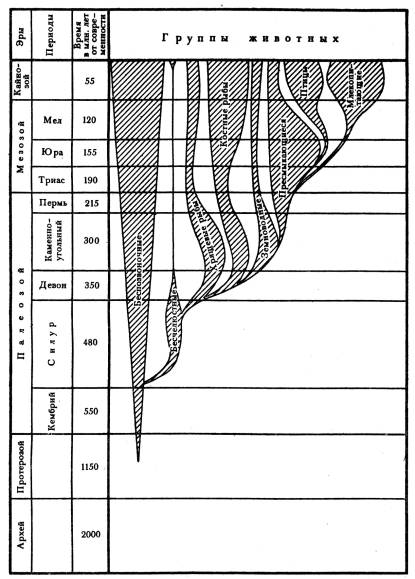 Таким образом, со времени появления жизни на Земле, она развивалась непрерывно. Ни природные катаклизмы, ни внутренние причины её не могли остановить. Постоянно увеличивался объём биомассы, количество видов животных и растений, занимались всё новые экологические ниши, усложнялись взаимоотношения между видами и внутри них, возрастала сложность строения животных и растений. Общий поток жизни (животных) показан на Рис.19
