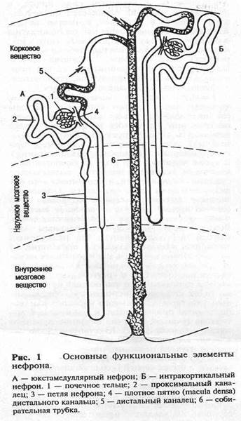 В почках млекопитающих и человека имеется несколько типов нефронов, различающихся по месту расположения клубочков в коре почек и по фукнкции канальцев: субкортикальные, интеркортикальные и юкстамедуллярные. Клубочки субкортикальных нефронов находятся в поверхностной зоне коры почек, юкстамедуллярные - у границы коркового и мозгового вещества почек. Юкстамедуллярные нефроны имеют длинную петлю Генле, спускающуюся в почечный сосокчек и обеспечивающуювысокий уровень осмотического концентрирования мочи. Для почек характерно строгое зональное распределение различных типов канальцев. В коре почек находятся все клубочки, проксимальные и дистальные извитые канальцы, корковые отделы собирательных трубок. В мозговом веществе располагаются петли Генле и собирательные трубки. От расположения отдельных элементов нефрона зависит эффективность осморегулирующих функций почек.