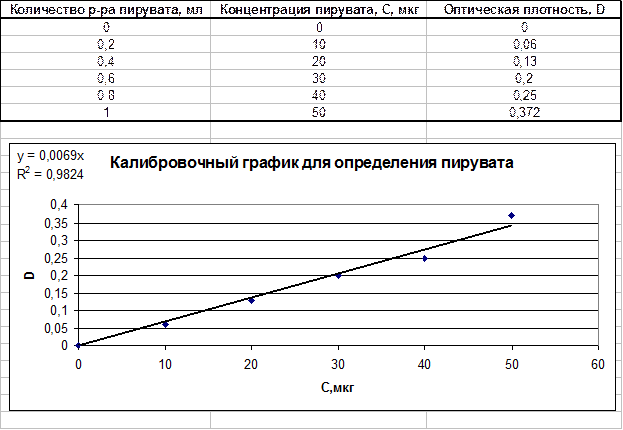 Стадия 1. Построение калибровочного графика для определения пирувата. Составляется ряд стандартных растворов пирувата (включая контроль – С=0). Строится график зависимости оптической плотности растворов от концентрации пирувата в растворах.