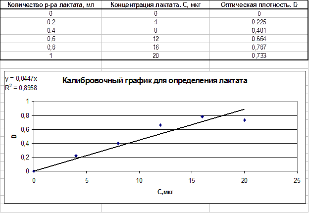 Стадия 2. Построение калибровочного графика для определения лактата. Составляется ряд стандартных растворов лактата (включая контроль – С=0). Строится график зависимости оптической плотности растворов от концентрации лактата в растворах.