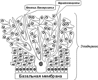 дендрическая клетка, располагающаяся в базальном слое. На один меланоцит приходится приблизительно 36 кератиноцитов. Функция меланоцита — синтез и секреция меланинсодержащих органелл (меланосом). Меланоциты передают меланосомы кератиноцитам. Клетки Лангерганса происходят из семейства макрофагов. Подобно макрофагам дермы они исполняют роль стражей порядка, то есть защищают кожу от внешнего вторжения и управляют деятельностью других клеток с помощью регуляторных молекул. Отростки клеток Лангерганса пронизывают все слои эпидермиса, достигая уровня рогового слоя. Клетка Лангерганса, которая имеет костномозговое происхождение, обладаетантигенпрезентирующей функцией и осуществляет иммунный надзор. Эти дендрические клетки располагаются преимущественно в шиповатом слое. Они впервые были описаны студентом-медиком Паулем Лангергансом в 1868 г. Считается, что клетки Лангерганса могут уходить в дерму, проникать в лимфатические узлы и превращаться в макрофаги. Это привлекает к ним большое внимание ученых, как к связующему звену размножения клеток базального слоя, поддерживая его на оптимально низком уровне. При стрессовых воздействиях, когда на поверхность кожи действуют химические или физические травмирующие факторы, клетки Лангерганса дают базальным клеткам эпидермиса сигнал к усиленному делению.