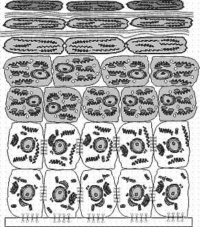 Три слоя, расположенные выше базального, отличаются гистологически и представляют собой различную степень дифференцировки кератиноцитов в роговые клетки при движении кнаружи. Непосредственно над базальным слоем находится шиповатый слой (stratum spinosum). Это название связано с тем, что большое количество десмосом и кератиновых филаментов создает впечатление шипов. Над шиповатым слоем располагается зернистый. В этом слое формируются кератогиалиновые гранулы, связывающие тонофиламенты в крупные электронноплотные массы в цитоплазме, что создает вид зернистости.