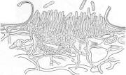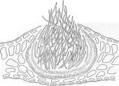 Ложе (сплошной слой) конидиеносцев с конидиями на плотном сплетении гиф грибницы у грибов рода Gloeosporium.