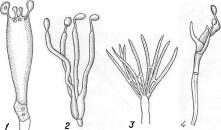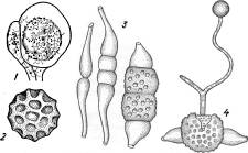 Первые из них одноклеточные и бывают двух типов— спорангиеспоры (неподвижные), покрытые оболочкой, и зооспоры — подвижные с одним-двумя жгутиками. Вместилища спорангиеспор называются спорангиями, а выросты, на которых они развиваются,— спорангиеносцами. У зооспор—соответственно зооспорангии и зооспорангиеносцы.
