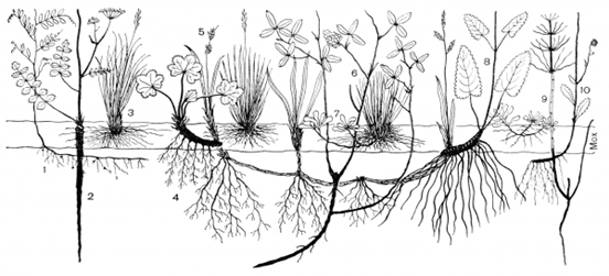 Вертикальный разрез через надземную и подземную части биогеоценоза суходольного луга. 1 — мышиный горошек; 2 — бедренец-камнеломка; 3 — овечья овсяница; 4 — манжетка; 5 — просяная осока; 6 — средний клевер; 7 — кошачья лапка; 8 — лекарственная буквица; 9 — хвощ; 10 — нивяник.
