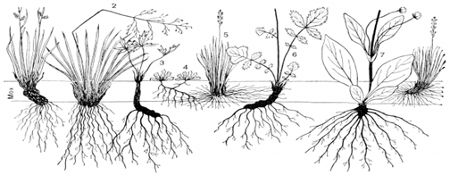 1 — осока бледная; 2 — щучка дернистая; 3 — лютик едкий; 4 — кошачья лапка; 5 — овсяница овечья; 6 - гравилат речной; 7 — сивец луговой.