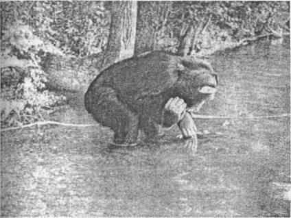 Рис. 4. Подросток шимпанзе, выпущенный в природные условия в Псковской области, рассматривает свое отражение в воде (Фирсов, 1977).