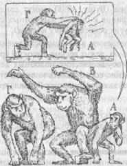 В результате накопления такой информации и непосредственного опыта детеныш в конце концов выучивается «правильно вести себя» в различных ситуациях и предвидеть возможное влияние поведения — его собственного и союзников на других животных. Например, если детеныш видит, что обезьяна В атакует Г, он понимает, что Г может повернуться и напасть на него самого (на рис. 7 это изображено как «мысленное представление» у А), т.е. переадресовать агрессию. Если А способен предвидеть такой поворот событий, то он может избежать нападения Г: не попадать под горячую руку. Более того, если А, наблюдая взаимодействия между В и Г, понял, что В старше по рангу, то он сообразит, что В — более выгодный для него союзник против Г, чем Г как союзник против В. Накапливая такой опыт, детеныш шимпанзе приобретает способность ловко лавировать в самых разных ситуациях.