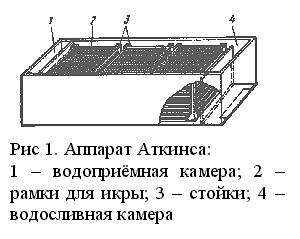Аппарат Аткинса применяется для инкубации икры лососей. Аппарат представляет собой прямоугольный деревянный или пластмассовый желоб длиной 1-2,4 м, шириной 0,35 м и высотой 0,4 м (рис. 1). Конструкция его торцовых сторон, у одной из которых подается вода, а у другой она сбрасывается такая же, как и в лотковом аппарате. В передней части аппарата иногда устанавливают поперечную перегородку, отделяющую водоприемную камеру. Она ниже бортов желоба на 5 см.