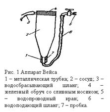 Аппарат Вейса используют для инкубации мелкой икры лососевых (белорыбицы, сиговых). Он представляет собой цилиндрический стеклянный, или из органического стекла, сосуд, суживающийся книзу (перевернутая большая бутылка без дна) (рис 1). Высота аппарата - 50 см, диаметр верхнего отверстия - 20 см, нижнего отверстия - 3 см Верхние края сосуда обтянуты обручем из оцинкованного железа. Нижнее отверстие аппарата (горло) закрыто пробкой с ввернутой по центру металлической трубкой диаметром 0,8-1 см. Наружный конец этой трубки соединен с резиновым шлангом, по которому поступает в аппарат вода из водопроводного крана. Чтобы не было "мертвого" пространства над трубкой, у стенок сосуда, где отсутствуют токи воды, это место заполняют воском или менделеевской замазкой, или пробке придают нужную вогнутую форму. Над пробкой укладывают металлическую сетку Токи воды, идущие из водопроводного крана, поступают под напором в нижнюю часть сосуда и поднимают вверх помещенную в аппарат икру. В верхней части сосуда напор воды ослабевает, поэтому икринки начинают постепенно опускаться в нижнюю часть его, где подхватываются струями воды и вновь увлекаются вверх. Таким образом, на протяжении всего периода инкубации икра находится в непрерывном движении в толще воды. Сброс воды из аппарата происходит через сливной носик, сделанный в железном обруче, обтягивающем верхние края сосуда. Перед сливным носиком установлена решетка, предохраняющая от выноса из аппарата икринок и вылупившихся предличинок.