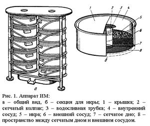 Аппарат ИМ (автор конструкции А. Н. Канидьев) предназначен для инкубации многослойной икры лососей. Он состоит из 10 секций, установленных на площадках каркаса. Секции размещены двумя вертикальными рядами. В одном ряду 5 секций. Размер аппарата 0,8х0,4х1,2 м (рис. 1, 2).