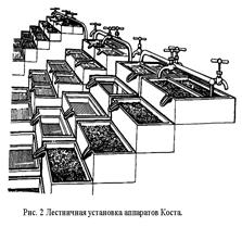 В каждую группу входят 4-6 аппаратов, снабжающихся водой одного крана. При таком размещении вода из крана поступает в верхний аппарат, а из него последовательно проходит через нижестоящие аппараты. Для обеспечения правильной циркуляции воды в аппаратах их размещают так, чтобы сливные носики каждого вышестоящего и нижестоящего аппаратов находились с противоположных краев (рис. 2). Установка в одну группу более 6 аппаратов Коста не рекомендуется, так как нижние аппараты будут получать воду, обедненную кислородом и содержащую большое количество вредных продуктов обмена из верхних аппаратов, что приведет к увеличенному отходу икры.