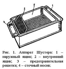 Аппарат Шустера состоит из двух ящиков, сделанных листового железа-наружного (размером 50х30х18 см) с глухими стенками и дном и внутреннего (размером 40х29х12 см) дном из металлической тканой сетки типа "Трепсе" с ячеей размером 18х3,5 мм (рис. 1). С внутренних сторон наружного ящика на высоте 6 см от дна имеются выступы, на которых держится внутренний ящик. При этом внутренний ящик вставляют в наружный ящик так, чтобы его сточный носик вдвигался в такой же носик наружного ящика. Перед сточным носиком вставляют решетку, предохраняющую от вымывания из аппарата икринок, которые размещены в один слой на сетчатом дне внутреннего ящика. Вода из крана поступает в наружный ящик (в промежуток в 10 см между боковой стенкой внутреннего и наружного ящика), а затем во внутренний ящик, омывая на своем пути икринки, лежащие на его сетчатом дне; далее вода сбрасывается через сливной носик. Аппарат покрыт асфальтовым лаком.