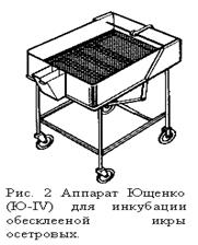 Аппарат Ющенко образца 1961 г. (Ю-IV) применяется для инкубации обесклеенной икры осетровых. Аппарат металлический, сложный по устройству, но простой в эксплуатации. Основная часть аппарата - ванна размером 70х62х21 см, которая установлена на раме, сделанной из 21-миллиметровых металлических труб (рис. 2).