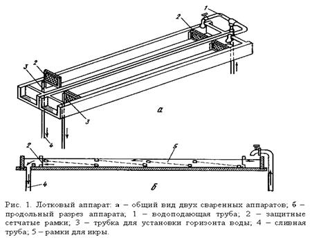 Инкубатор состоит из металлической ванны размером 140 x50х15 см и вставленного в нее металлического вкладыша размером 120х45х10 см с сетчатым дном с ячеей размером 1- 1,1 мм Вкладыш разделен выдвижной перегородкой на две части меньшую инкубационную часть и большую для выклева свободных эмбрионов. В инкубационную часть аппарата помещают 300 тыс. обесклееиных икринок рыбца.