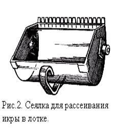 Оплодотворенную икру укладывают на сетчатое дно внутреннего сосуда слоем в 8-10 см, то есть в 10-15 рядов в количестве около 30 тыс. икринок, а затем закрывают его конусной крышкой. Общая вместимость аппарата составляет около 300 тыс. икринок.