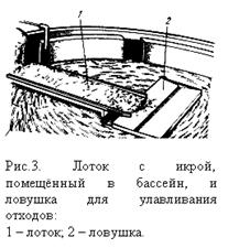 Загружают лотки икрой специальной сеялкой (рис. 2). Оплодотворенную икру помещают в сеялку и распределяют по дну лотков. На один лоток рассеивают 1 кг икры белуги, или 800 г икры осетра, или 500 г икры севрюги, или 800 г икры шипа. После приклеивания икринок лотки устанавливают наклонно в раму аппарата. При этом в каждых двух последовательно устанавливаемых один за другим лотках уклон направлен в противоположные стороны. Так, например, если верхний лоток имеет уклон в левую сторону, то лежащий под ним следующий лоток наклонен в правую сторону, и наоборот. Благодаря такой установке лотков вода, поступающая из крана в самый верхний лоток, самотеком проходит по всем лоткам, омывает на своем пути икринки и затем сбрасывается из нижнего лотка в канализационную систему. Инкубация икры в этом аппарате происходит в чистой, стерильной воде. Если на завод поступает мутная вода, то лоточный аппарат должен снабжаться водой из отстойника. В случае обилия планктона в воде отстойник необходимо снабдить фильтром из мелкоячейного газа во избежание проникновения планктона в бактерицидную установку и уменьшения эффекта стерилизации воды Расход воды на 1 лоточный аппарат-18 л/мин. За несколько часов до вылупления предличинок лотки поочередно вынимают из аппарата и переносят в бассейны, где их кладут на подставки, смонтированные из дюралюминиевых уголков. Подставку с лежащим на ней лотком устанавливают так, чтобы поступающая в бассейн вода падала на один конец летка, а вытекала с другого конца в специальную ловушку, сделанную из оцинкованного железа (рис 3). Вылупившиеся предличинки смываются водой из лотка в ловушку, из которой они выносятся в бассейн. Погибшие икринки и оболочки, оставшиеся после вылупления предличинок, также смываются в ловушку, но из нее в бассейн не попадают. Когда инкубация икры полностью закончится, из бассейнов вынимают лотки, подставки и ловушки, создавая условия для содержания в них предличинок.