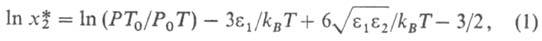 где Р°2- давление паров над чистым сжиженным газом при данной т-ре системы; р2 - парциальное давление газа; звездочкой обозначаются параметры в-ва в условиях равновесия. Индексы "1" и "2" относятся соотв. к р-рителю и газу. Идеальная р-римость x*2,ид-ф-ция только т-ры, св-ва р-ри-теля влияния на нее не оказывают.