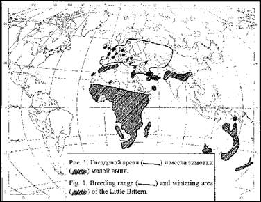 Малая выпь (Ixobrychusminutus) распространена очень широко. Она гнездится повсюду в Европе, кроме Британских о-вов, Дании, Норвегии, Швеции, Финляндии и северных районов Европейской территории России, находящихся севернее 60 параллели. Обитает также в Малой, Передней и Средней Азии, Юго-Западной Сибири (западнее 900 в. д.), Северной Индии, почти по всей Африке (за исключением большинства северных и самых южных районов), на Мадагаскаре, Новой Гвинее, в Восточной и Юго-Западной Австралии, Новой Зеландии (рис. 1). В Западной и Южной Европе, на Ближнем Востоке и севере Африки ареал пятнист, птицы гнездятся изолированными поселениями в благоприятных биотопах. В последние десятилетия найдена на гнездовье в Тунисе (Thomson, Jacobsen, 1979), Омане (Gallagher, 1986), в Персидском заливе (Bundy, Warr, 1980). Многие местообитания вида в Европе уничтожаются вследствие осушения болот и коррекции речных берегов.