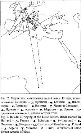 Голландские малые выпи имеют южную (юго-восточную и юго-западную) направленость осенней миграции и разлетаются на территории Бельгии, Франции, Испании, Италии, проникая и в Северную Африку (рис. 2). Осенняя миграция птиц из Голландии идет тремя путями (рис. 3): первый по атлантическому побережью Бельгии и Франции; второй – через Южную Францию и средиземноморское побережье Испании и третий – наверное самый массовый – через юг Франции, Аппенинский полуостров, о-в Сицилию к Ливии. Покидают птицы места гнездования через один-два месяца после вылета молодых из гнезда. Самые ранние встречи окольцованных голландских малых выпей были во Франции – 2.09., Испании – 23.09, Италии – 27.09. и в Ливии – 13.09. Последняя особь достигла Ливии через 2 месяца и 15 дней после кольцевания в Голландии. Взрослые птицы мигрировали раньше, так как появились в Испании уже 18.08. Максимальное расстояние, которое преодолевают голландские малые выпи на пути к североафриканскому побережью, составляет примерно 2000 км.