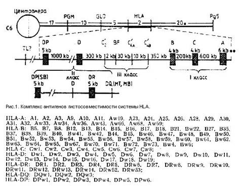 Схематически строение системы HLA представлено на рис.1. Размер комплекса HLA составляет 2 сантиморгана ( единицы рекомбинации). Линейная последовательность и расстояние между локусами представлены в kb (тысячах пар нуклеотидных последовательностей).