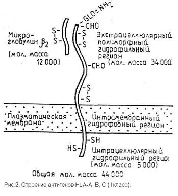 Антигены I класса явяются мембранными гликопротеинами, состоящими из двух частей: глигозилированной полипептидной тяжелой цепи (см.рис.2) с молекулярной массой 44000 и b2-микроглобулина с молекулярной массой 12000. Молекулы HLAII класса также являются гликопротеинами (см. рис.3), но состоят из двух нековалентно соединенных цепей a иb с молекулярной массой 34000 и 29000 соответственно. [3]