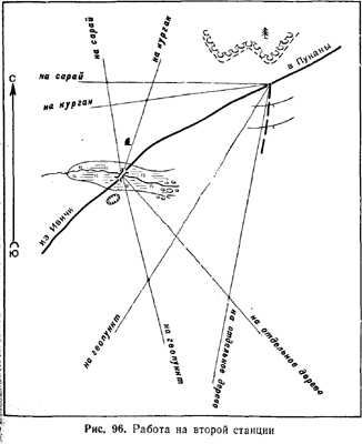 Съемка ведется обходом участка по дорогам, берегу реки, опушке леса, вдоль линии связи и т. п. Направления, по которым ведется съемка, называются ходовыми линиями, а точки, на которых определяюгся и прочерчиваются направления новых ходовых линий,—станциями.
