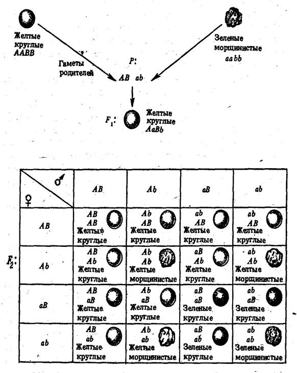 Проводя скрещивание гомозиготных родительских форм, имеющих желтые семена с гладкой поверхностью и зеленые семена с морщинистой, Мендель получил все растения с желтыми гладкими семенами и сделал вывод, что эти признаки являются доминантными. Во втором поколении после самоопыления гибридов Р1 он наблюдал следующее расщепление: 315 желтых гладких, 101 желтых морщинистых, 108 зеленых гладких и 32 зеленых морщинистых. Используя другие гомозиготные родительские формы (желтые морщинистые и зеленые гладкие), Мендель получил аналогичные результаты и в первом, и во втором поколениях гибридов, т. е. расщепление во втором поколении в отношении 9: 3 : 3 : 1 (Приложение 3).