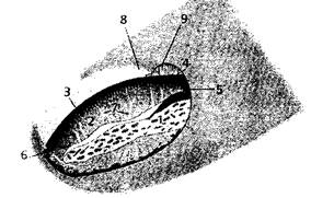 1- костная фаланга, 2 - дерма, 3 - ногтевая пластина, 4 - корень ногтя, 5 – матрикс (матрица), 6 - гипохиний, 7 - связочки ногтя (уздечка ногтя), 8 - эпонихий. 9 - задний ногтевой валик