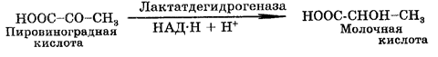 В процессе превращения пировиноградной кислоты в лактат происходит регенерирование НАД+ , что поддерживает непрерывность гликолиза в анаэробных условиях. Этиловый спирт образуется из пирувата при метаболизме дрожжей и некоторых других микроорганизмов спиртового брожения. Суммарная реакция превращения глюкозы в этанол имеет следующий вид: