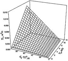 Рис. 5. Зависимость коэффициента турбулентной диффузии Dт от диаметра трубчатого турбулентного аппарата dк и линейной скорости движения жидких потоков Vк.