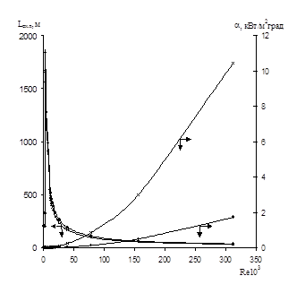 При переходе от ламинарного к турбулентному режиму течения жидких потоков при условии постоянства производительности процесса W (выбрано W=VЧpЧR2=10,3 м3/ч), длина зоны охлаждения заметно уменьшается (рис. 1).