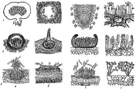 Рис. 1. Типы плодоношений и плодовых тел грибов (на поперечных срезах):