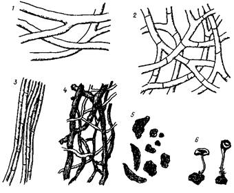 1 – одноклеточная грибница; 2 – многоклеточная грибница; 3 – шнуры; 4 – ризоморфы; 5 – склероции; 6 – склероции, проросшие плодовыми телами
