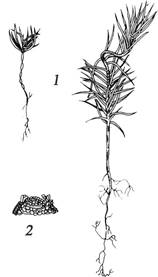 Рис. 4. Сосновый вертун. 1 – одно-двухлетние сеянцы, поврежденные болезнью; 2 – эцидий гриба;