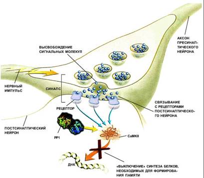 Молекулярный механизм забывчивости. Процесс запоминания в гиппокампе, куда поступает новая информация, происходит в три стадии: — нервный импульс вызывает высвобождение сигнальных молекул („молекул памяти“) из нервных окончаний аксона пресинаптического нейрона; — молекулы нейромедиатора связываются с рецепторами постсинаптического нейрона; — рецепторное связывание активирует фермент СаМКII, участвующий в формировании памяти. PP1 блокирует CaMKII. В результате этот фермент теряет способность посылать сигналы о начале синтеза белков, необходимых для формирования нервного импульса. Так PP1 „выключает“ механизм запоминания. |