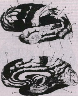 1 – проекционная двигательная зона; 2 – центр поворота глаз и головы в противоположную сторону; 3 – проекционная зона чувствительности; 4 – проекционная зрительная зона. Проекционные гностические зоны: 5 – слуха; 6 – обоняния; 7 – вкуса; 8 – гностическая зона схемы тела; 9 – зона стереогноза; 10 – гностическая зрительная зона; 11 – гностическая зона чтения; 12 – гностическая речевая зона; 13 – зона праксиса; 14 – праксическая речевая зона; 15 – праксическая зона письма; 16 – зона контроля за функцией мозжечка