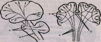 Рис. 14. Срединный разрез мозжечка. Правое полушарие мозжечка и правая половина червы
