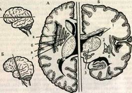 Между подкорковыми ядрами основания (таламусом и хвостатым ядром, с одной стороны, и ядром – с другой) находится прослойка белого вещества, называемая внутренней капсулой . Она делится на три отдела: переднее бедро, расположенное между хвостатым и чечевицеобразным ядрами, заднее бедро, расположенное между зрительным бугром и чечевицеобразным ядром и колено внутренней капсулы.