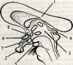 1 – мозолистое тело; 2 – гипофиз: 3 – зрительный бугор; 4 – шишковидная железа; 5 – серый бугор; 6, 7, 8 – ядра гипоталамуса