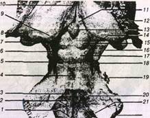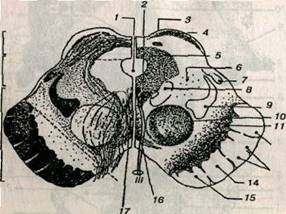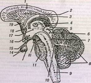 1 – мозолистое тело; 2 – прозрачная перегородка; 3 – свод; 4 – межталамическое сращение; 5 – эпифиз; 6 – крыша среднего мозга; 7 – водопровод среднего мозга; 8 – мозжечок; 9 – продолговатый мозг; 10 – четвертый желудочек; 11 – мост; 12 – нейрогипофиз; 13 – аденогипофиз; 14-воронка; 15 – серый бугор; 16 – гипоталамус; 17 – третий желудочек; 18 – передняя спайка; 19 – концевая пластинка