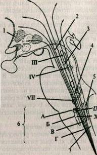 1 – ядра гипоталамуса; 2 – сон, бодрствование, сознание; 3 – зрительная пространственная ориентация, высшая вегетативная координация процесса поглощения пищи (жевание, облизывание, сосание и др.); 4 – ядерный центр регуляции дыхания, вегетативной координации дыхания и кровообращения, акустическо-вестибулярная пространственная ориентация; 5 – вегетативное ядро блуждающего нерва; б – область вегетативной координации артериального давления, сердечной деятельности, сосудистого тонуса, вдоха и выдоха, глотания, тошноты и рвоты: А – глотание; Б – вазомоторный контроль; В-выдох; Г – вдох; 7 – триггерная зона рвоты; III, IV, VII, IX, Х – черепные нервы