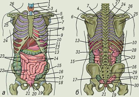 Взаиморасположение внутренних органов и скелета человека (а — вид спереди, б — вид сзади): 1 — щитовидный хрящ; 2 — щитовидная железа; 3 — дыхательное горло (трахея); 4 — левая ключица; 5 — грудина; 6 — левая лопатка; 7 — левое легкое; 8 — ребра; 9 — сердце; 10 — печень; 11 — желудок; 12 — селезенка; 13 — поперечная ободочная кишка; 14 — петли тощей кишки; 15 — нисходящая ободочная кишка; 16 — подвздошная кость; 17 — сигмовидная ободочная кишка; 18 — лобковая кость; 19 — седалищная кость; 20 — мочевой пузырь; 21 — прямая кишка; 22 — петли подвздошной кишки; 23 — восходящая ободочная кишка; 24 — правое легкое; 25 — правая лопатка; 26 — правая ключица; 27 — позвоночник; 28 — правая почка; 29 — крестец; 30 — копчик; 31 — левая почка.