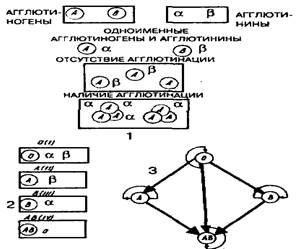 При наличии одноименных агглютиногенов и агглютининов (А и α, В и β) происходит реакция агглютинации (склеивания).
