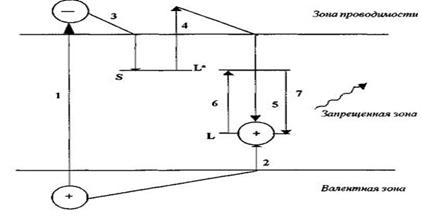 Рис. 2. Механизм термолюминесценции: 1 — переход электрона из валентной зоны в зону проводимости; 2 — захват дырки центром люминесценции; 3 — захват электрона ловушкой; 4 — освобождение электронов при нагреве кристалла; 5 — рекомбинация электронов с дырками в центрах люминесценции; 6 — возбуждение центра люминесценции; 7 — излучательный переход в основное состояние.