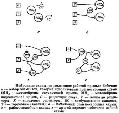 Теперь наша схема будет работать. Для нее нам потребовалось 3 рецептора и 3 интернейрона. Можно сделать схему и экономнее. Например, на рис. 52, г приведена схема, в которой есть вставочный нейрон С А, все время работающий сам по себе. Он будет все время стремиться закрыть крылья, которые будут закрыты всегда, кроме ситуации, когда одновременно работают рецепторы X и С; в этом случае они возбуждают интернейрон ИН 2. Цифра «2» указывает, что его порог так высок, что свет и холод поодиночке не способны его возбудить. Этот интернейрон при возбуждении откроет крылья и затормозит спонтанно активный интернейрон. Вы видите, что в этой схеме мы обошлись всего двумя типами рецепторов. Правда, один из интернейронов в этой схеме обладает более хитрыми свойствами, чем стандартный нейрон: он может работать сам по себе.