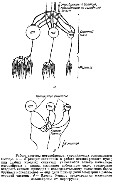 Управляющие команды от верхних отделов мозга приходят по волокнам, которые равномерно распределены по всему МН-пулу. Если возбуждено небольшое число этих управляющих волокон, возбудятся только самые мелкие МН, и мышца будет развивать небольшое усилие. Чем большее число управляющих волокон будет возбуждено, тем большее число синапсов на МН будет активировано и тем более крупные МН включатся в работу. Таким образом, управляя только одним параметром — числом возбужденных нисходящих волокон, мозг включает в работу те мышечные волокна, которые нужны для выполнения требуемого движения.